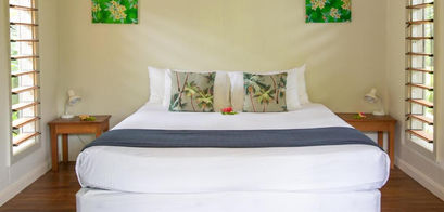 These Traditional Fijian Huts are located in our beautiful tropical gardens, they are just a few short steps to the beach. Each Bure has its own private open-air bathroom. You'll love our open roofed showers, they, of course, are completely private, offering that back-to-nature feel, gaze up at the trees, blue sky or stars at night. These rooms are serviced daily. In addition to our fluffy bath towels, we also provide fresh beach towels each day. These rooms are air conditioned for your comfort